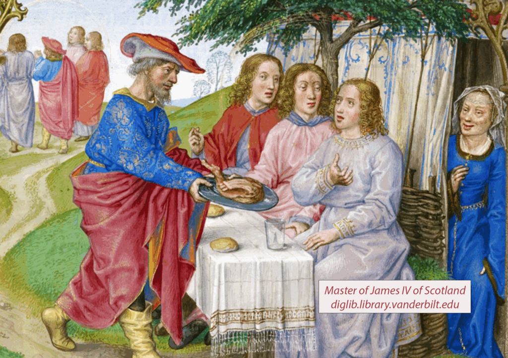 “The LORD appeared to Abraham. . . as he sat in the entrance of his tent, while the day was growing hot. Looking up, Abraham saw three men standing nearby. When he saw them, he ran. from the entrance of the tent to greet them; and bowing to the ground, he said: ‘Sir, if I may ask you this favor, please do not go on past your servant. . . . Rest yourselves under the tree.’” The three men rested with Abraham who attentively  “ministered to them”. Genesis 18:1-10